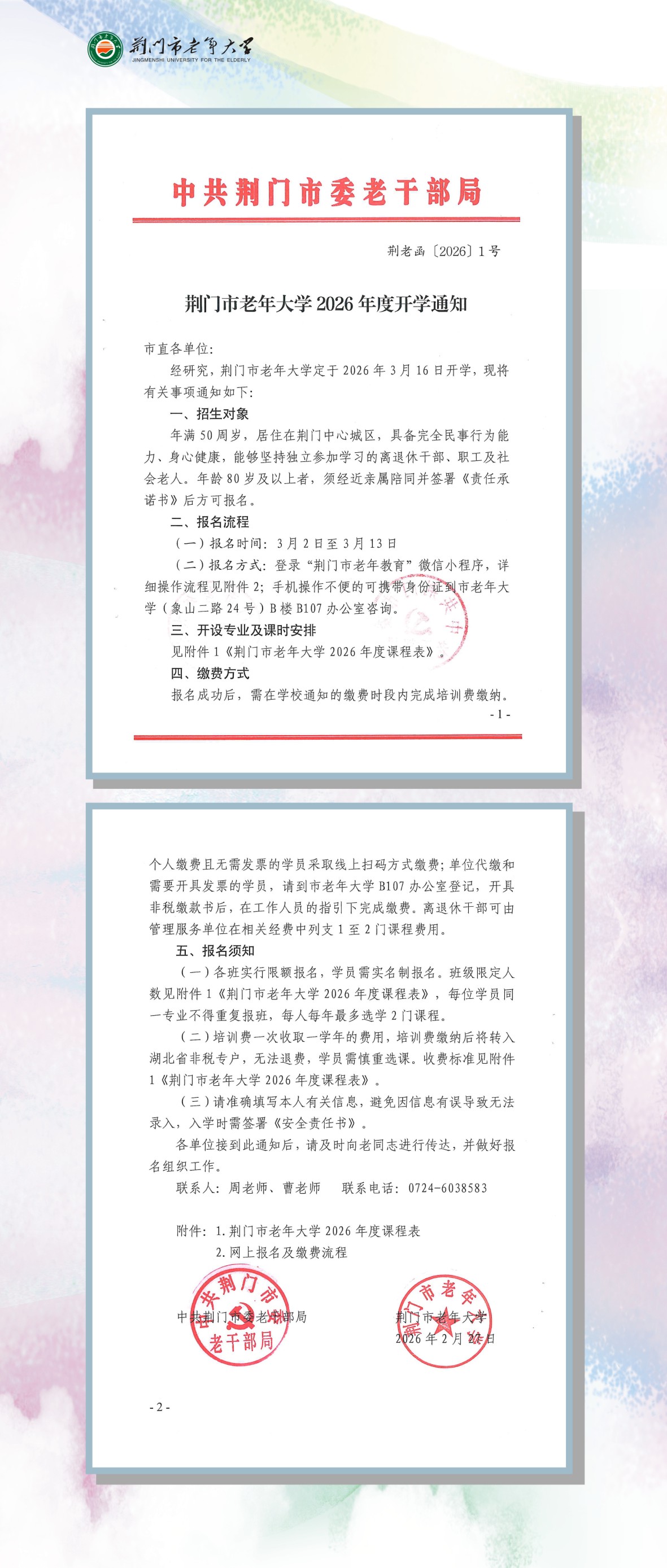荆门市老年大学2026年度开学通知